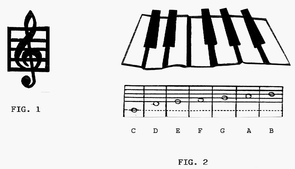 The pieces of music are read in the G key (also called the Violin key) (fig. 1) and can be reproduced on the piano or on a keyboard (central section), using the right hand (fig. 2).